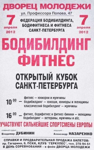 не могу не согласится... Сначала во время регистрации потеряли на "дамочек" более 2 часов, пока обились от них вменяемости. Затем во время турнира также 2 часа на "виляния попой" по подиуму. Это красиво 5, от силы 10, минут. А далее уже просто - быстрее бы этот балаган закончился.бикини конечно здорово и красиво,но это другие соревы,почему нельзя разделить с билдингом? есть еще вариант,сначала выступают качки,а потом сидя в зале , поглащая торты и пожирая глазом ягодицы прекрасного пола,наслаждаются жизнью,а не охеревают за кулисами от голода и обезваживания?