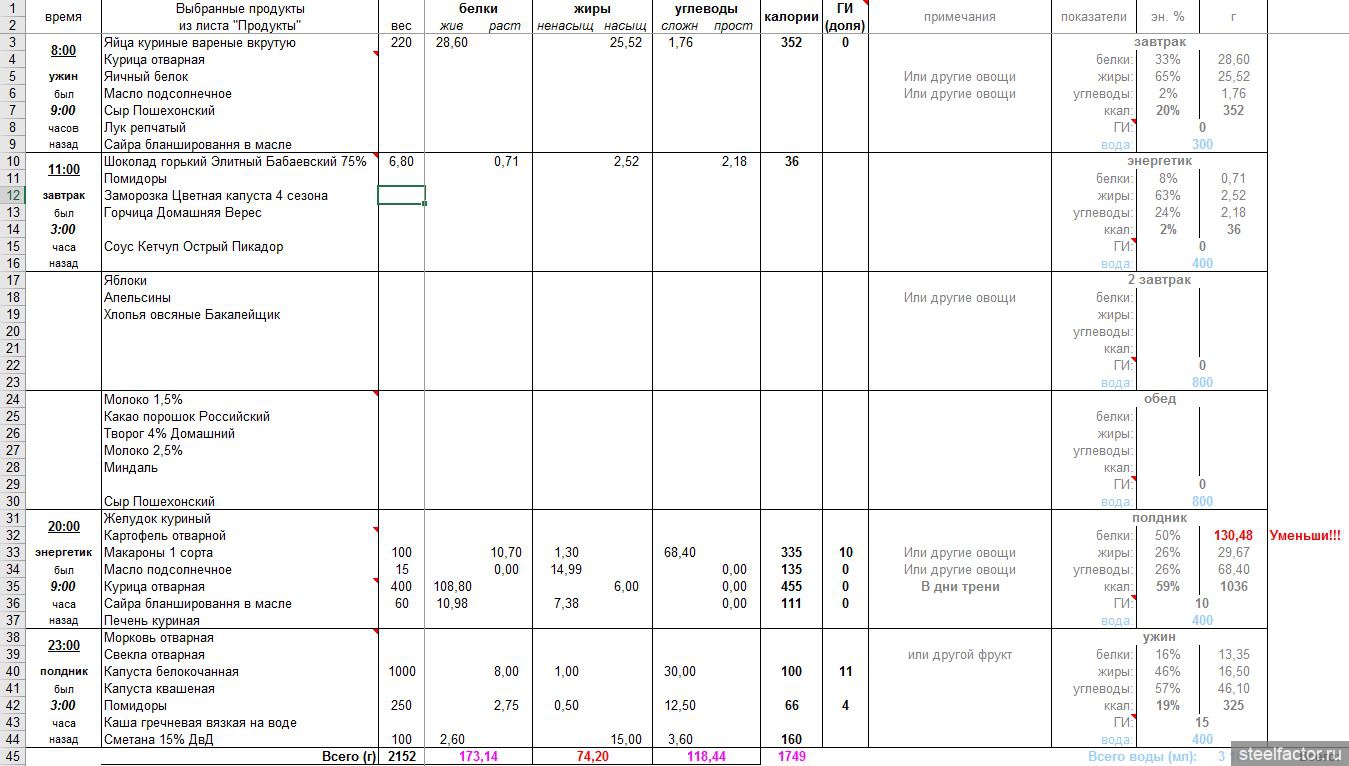 Всем доброго времени суток ! Придерживаюсь ГД уже восьмую неделю, калорийность 1800, загрузка углями каждую неделю в субботу, вес снизил с 95 до 88, при чем опустился ниже 90 в первые 4 недели, сейчас вес скачет +-1.5 кг между 88 и 90, упорно не падает. Активность средняя, 5 км быстрым шагом 5 дней в неделю, в выходные велосипед 50-150 км в быстром темпе грунты\асфальт, так же 3 раза в неделю турник по 3-4 повторения 12 подтягиваний, штангу иногда тягаю в 70 кг, жим лежа, тяга к поясу в наклоне, когда велосезон закончиться подключу в выходные еще 6 км в день быстрым шагом. Рацион скинул во вложение. Рацион однообразен, в загрузку ограничение по фруктозе в 50 г и жира в 30(макароны, баранки, хлеб, крупы, картошка, немного пряников), белки фоном, в пятницу перед субботней загрузкой лоу карб день, утром в субботу перед загрузкой вело треня на 20 км на пределе скорости, либо штангу мучаю. В воскресение на следующий день после загрузки, день тоже лоу карб, угли только из зеленых овощей, творога, орехов, по калорийности 1800 так же как и в другие дни. Из бадов принимаю аскорбиновую кислоту пакетик в день, 6 таблеток Аспаркама, настойку Элеутероукокка, рыбий жир из консервированной рыбы и глицин 4 таблетки. Подскажите что делать, резать угли в прочие дни кроме загрузки или увеличивать движуху ? В прошлый раз с той же движухой +5км быстрым шагом 5 дней в неделю, выходные вместо велосипеда было 5 км ходьбы и загрузки раз в 2 недели, вес отлетал по 700 грамм в неделю, удалось опуститься до 84.2 кг. P.S. от прошлой диеты отдыхал 2 месяца, наотдыхал +10 кг, так что вроде должен был восстановиться.