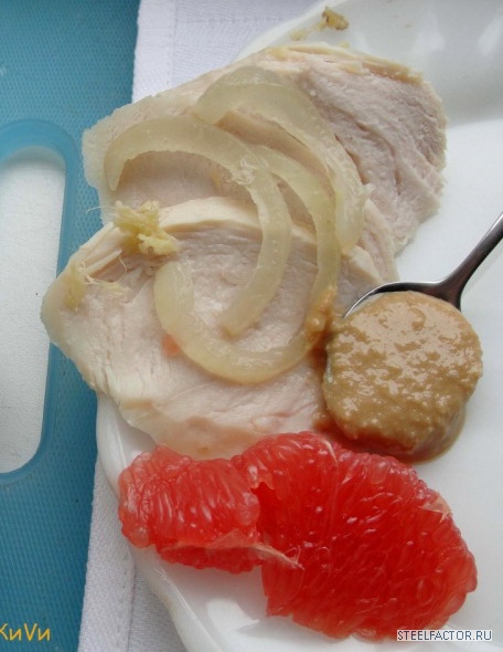 1. Куриное филе натереть солью и перцем, лук нарезать полукольцами, имбирь натереть и засыпать луком и имбирем филе, оставить на несколько часов в холодильнике. Готовить 20 минут на пару.
