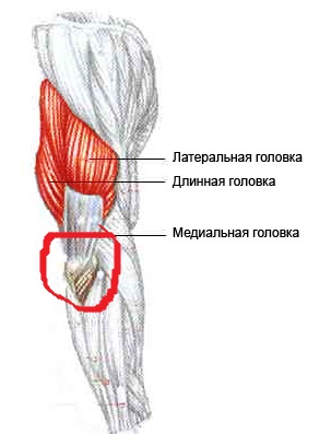 А если потрогать снаружи локтя, то там прощупывается мощнейшее сухожилье, дающее начало мышце , которая заходит внутрь, под две наружные головы(подкову) они разгибающие, а эта голова жмущая, вот здесь уже травмировать , надо постараться.