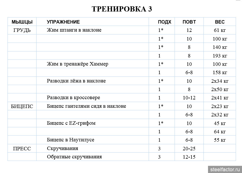 Сплит и программа тренировок, представленные в этой главе, представляют мой график тренировок с 1995 года и по сей день. Это сплит на четыре части, в котором я тренируюсь четыре дня из семи. Кроме мышц пресса, я везде делаю один главный рабочий сет для каждого из упражнений. В таблице указаны и разминочные подходы. В большинстве рабочих сетов я делаю два или три вынужденных повторения и иногда использую негативы, отдых-паузу или частичные повторения. Для некоторых частей тела (как будет объяснено в отдельных главах) я использую принцип предварительного утомления, а в некоторых упражнениях – принцип дроп-сета.