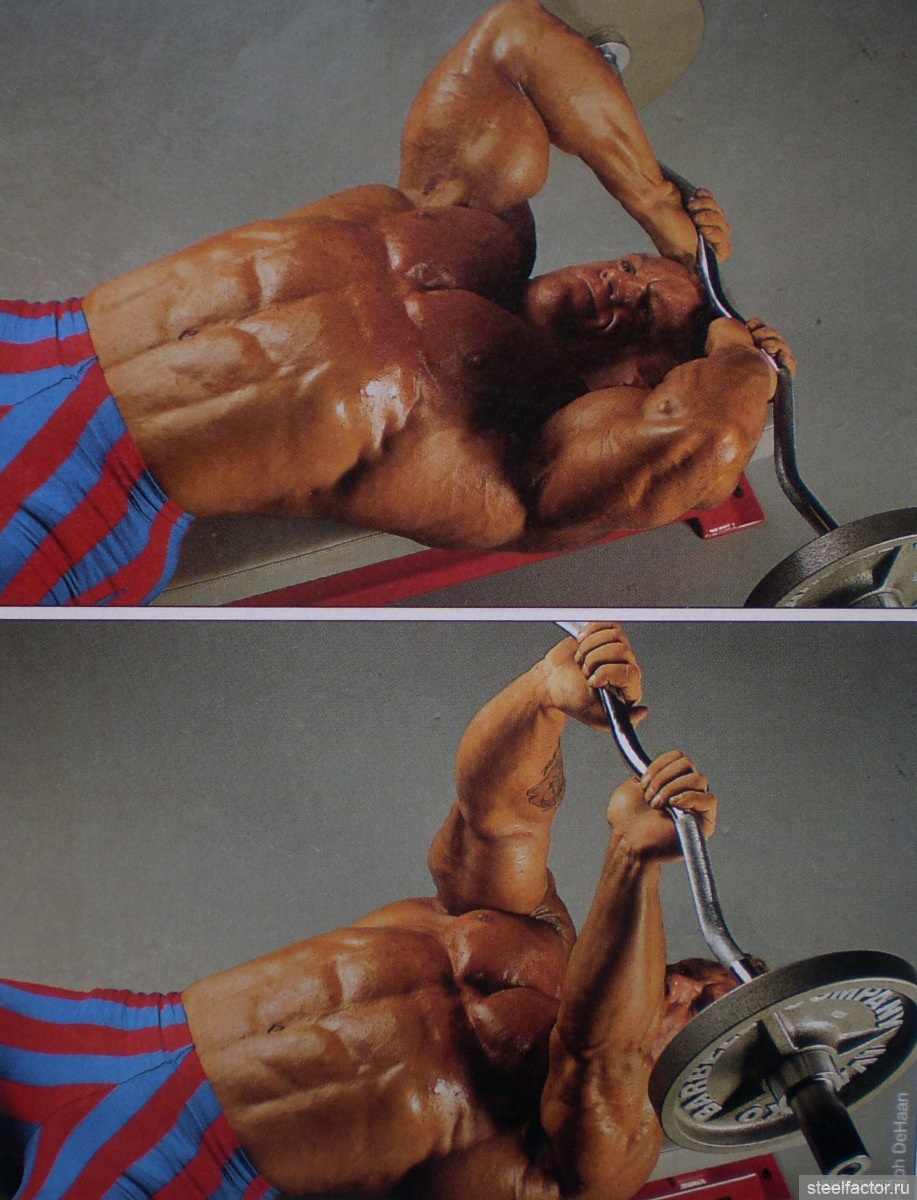 Начните это движение, лёжа на скамье и удерживая штангу над головой. Я делаю это упражнение немного иначе, чем многие бодибилдеры. Ортодоксальный способ продолжить – опустить штангу ко лбу, а затем надавить на неё, пока штанга не окажется прямо над лицом. Я же опускаю гриф до точки чуть выше моей головы. Затем я выжимаю снаряд вверх, сохраняя этот небольшой угол наклона, при котором штанга – когда руки почти прямые – оказывается прямо над исходным положением, то есть в точке чуть выше моей головы. Может показаться, что вы толкаете вес назад под углом. Но на самом деле это не движение назад; это прямое движение вверх. Я не распрямляю локти полностью в верхней позиции. Это поддерживает постоянную нагрузку на трицепс.