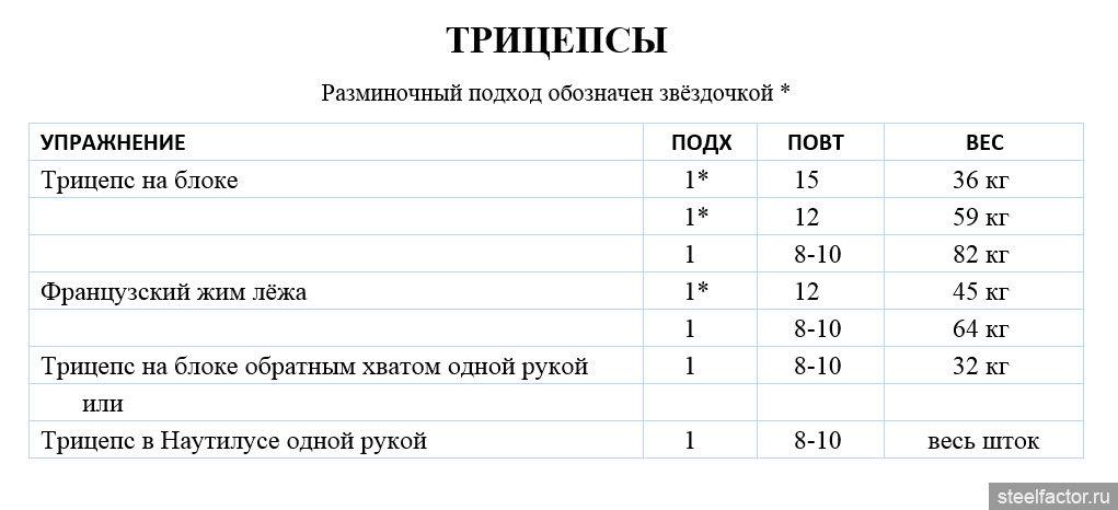 Тренировка трицепса не должна требовать большого объёма. Это связано с тем, что трицепсы используются при выполнении любых жимовых упражнений. Например, во время жима лёжа трицепсы работают почти так же интенсивно, как и грудные мышцы. То же самое и с упражнениями на плечи, такими как жимы над головой. Поскольку трицепсы стимулируются во время работы с плечами, я тренирую их после дельт.