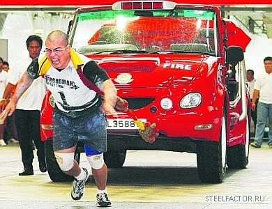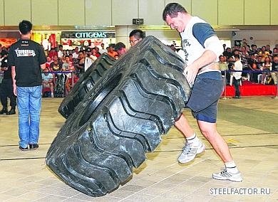 Есть Tyre Flip. Не обычная автомобильная, а те, которые массой 250 кг. Большинство считает это упражнение в стронгмене наиболее требовательным. Так же считает и победитель соревнования Чар Чун Ху.