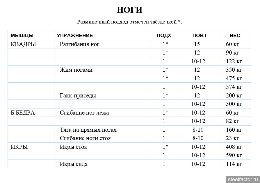 Ноги! Сочетание четырёхглавой мышцы, мышц задней поверхности бедра и икр составляет самую большую и мощную мышечную сеть человеческого телосложения. Ноги составляют половину тела, и, поскольку требования к их развитию очень велики, а упражнения весьма интенсивны, я посвящаю им отдельную тренировку.
