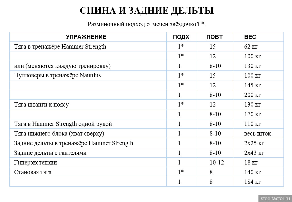 Я рассматриваю спину как объёмный объект, в котором ширина и толщина должны развиваться на взаимодополняющей основе. Принимая это во внимание, следует также понимать, что область спины после бёдер является самой большой, самой мощной и сложной группой мышц тела. Поэтому я посвящаю этому отделу целую тренировку. Однако я также включаю задние дельты в тренировку спины. Хотя задние дельты и являются частью структуры плеч, они, из-за того, что задействованы в таком большом количестве тяговых движений, получают очень много работы во время тренировки спины. Поэтому я считаю оптимальным тренировать их во время этой тренировки.