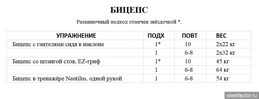 Поскольку на бицепс уже проведена большая работа, разминка здесь не требуется. Я делаю только один основной подход на каждую руку. Опять же, стиль очень строгий, поскольку я медленно сгибаю вес и в финальной точке каждого повторения сжимаю бицепс до полного его сокращения, прежде чем медленно вернуться в исходное положение. Между шестым и восьмым повторением я добьюсь отказа, затем мой партнёр поможет мне выполнить два форсированных повторения.