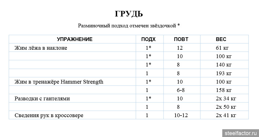 Я сделаю разминку подходом из восьми повторений, прежде чем перейти к основному подходу. Используя строгую технику, я медленно делаю от шести до восьми повторений до отказа, а затем либо сбрасываю вес и сразу беру более лёгкую пару снарядов и делаю ещё четыре-пять повторений (в стиле дроп-сета), или я позволю своему партнёру помочь мне выполнить пару форсированных повторений.