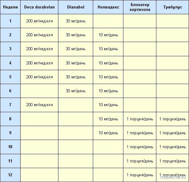 Деку с начала можно поставить с загрузкой 400мг а потом по такому же плану,только шестая неделя перерыва,Я не понял зачем,наверное больная фантазия автора..метанчик в норме,нолвадекс некчему на протяжении курса, блокаторы и трибулюс это уже не часть курса,это так БАДы..