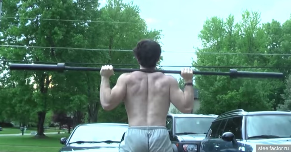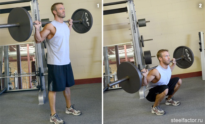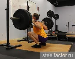1. Вопервых стойка. Возьмите штангу (забудьте блины в руках) и положите на плечи. Руки должны быть сведены, близко к плечам, лопатки сведены, локти смотрят вниз. Тогда из трапеции образуется подушка для штанги. Не ложите штангу на шею или на лопатки.