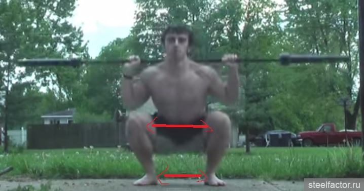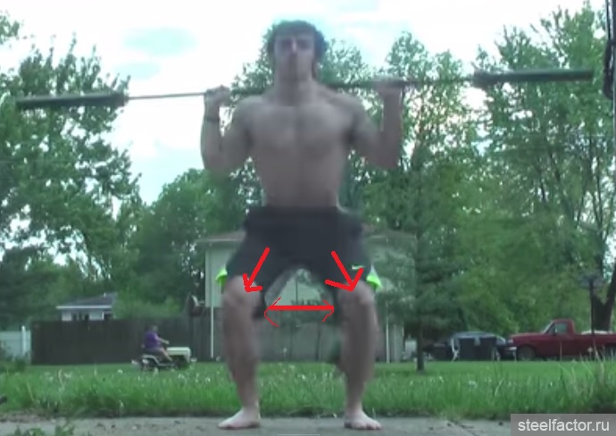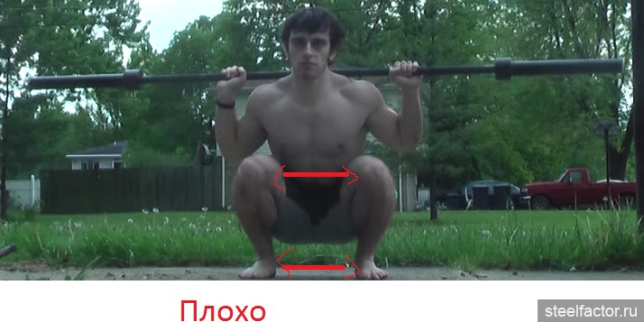 Смотрите не перестарайтесь с коленями чтобы не перенесли вес на носки. Вес всегда остается на пятке и внешней поверхности стопы. Колени должны уходить вперед только на столько, насколько нужно чтобы спина опустилась строго вниз