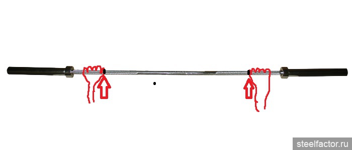 берись хватом шире меток, по середине между метками и блинами.Привет
