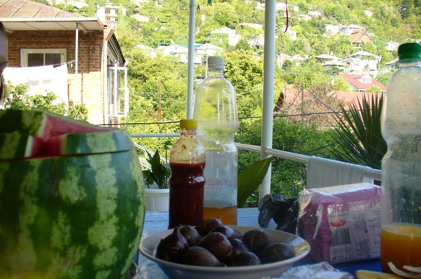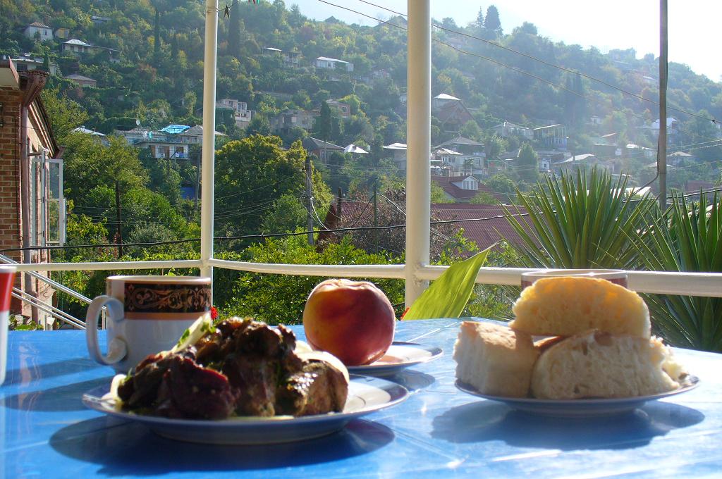 А брали мы все по 200 гр.шашлыка,соус ткемали,лаваши,сыр,мамалыгу(такая каша),салат из свежих овощей,местное вино и сок.Такая дешевизна связана с тем,что город нищий,а туристов мало,так как все еще боятся туда ездить.