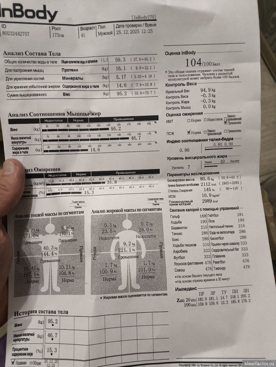Померили мне процент жира в организме, тренер который проводил сказал форма отличная, но надо чуть жир снизить. я сказал. что на массе и только что прошел силовой цикл и форму еще к лету сделаю. Когда он увидел получившийся результат у него глаза округлились, общая оценка из 100 баллов - 104, там написано, что если мускулатура развита то оценка может быть даже больше 100 баллов)))