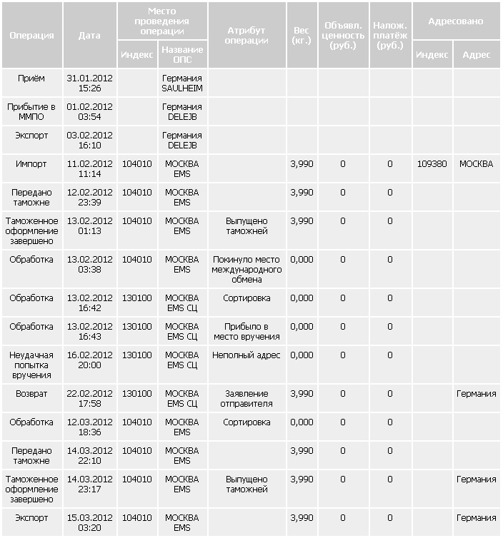 Короче, повторюсь: америкосы пишут адрес правильно, а фашисты заклеивают ихнюю наклейку своей. на которой номер квартиры один раз отсутствовал, а два раза отсутствовала последняя цифра. Дважды на почте забирал (извещения, соответственно, не было), а один раз ЕМС позвонил (курьер) заранее и уточнил, куда.