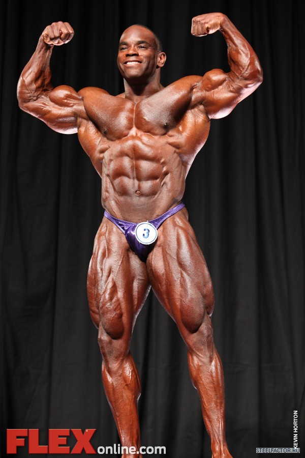 Высокий, где-то 182,5 см. Хорошая кондиция, но не на уровне Декса и Хита. Бицепсы бёдер - натянуты, ягодицы - нет. Нужна толщина в нижней части спины и больше руки. Должен добавить больше массы, чтобы соответствовать росту. Ноги - большие, пресс натянут. Руки "удерживают" его, по сравнению с его размерами.