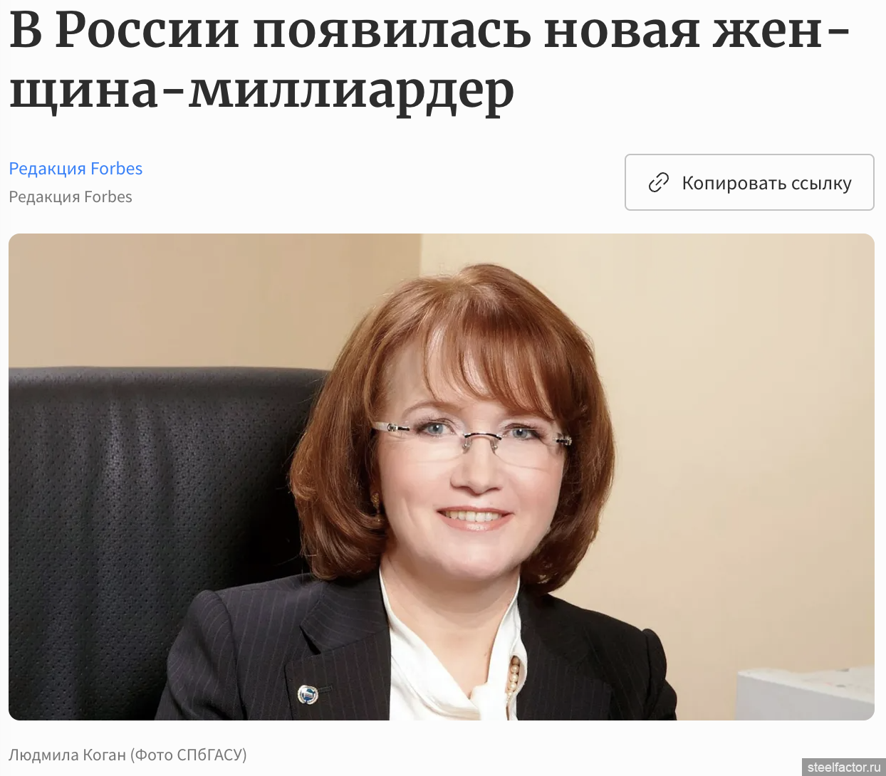 В топ-10 богатейших женщин страны впервые вошла вдова петербургского бизнесмена Владимира Когана Людмила. Такие данные приводятся в обновленном рейтинге Forbes.