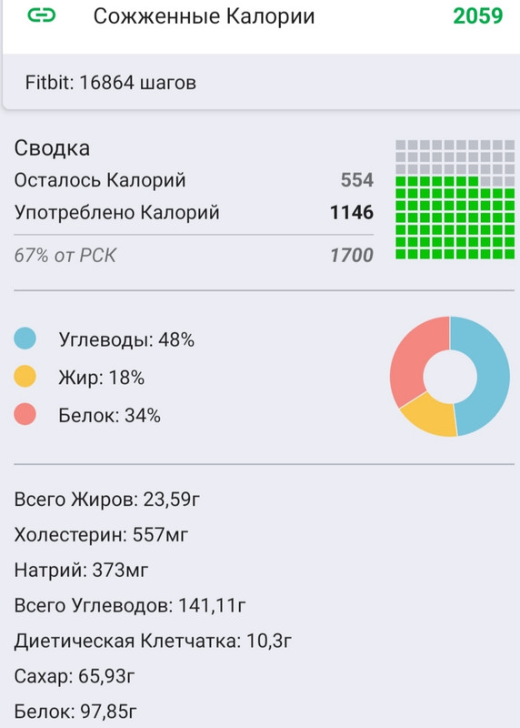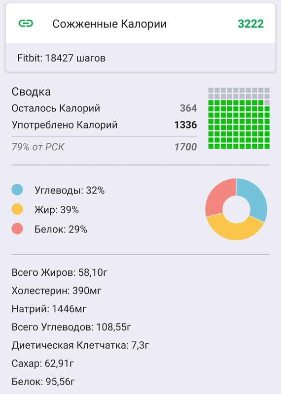 По еде вышло вот так, перебор с углеводами, буду корректировать. Это видимо из-за двух бананов и двух апельсинов. Синхронизировала это приложение с приложением по занятиям, теперь высвечиваются потраченные кк.