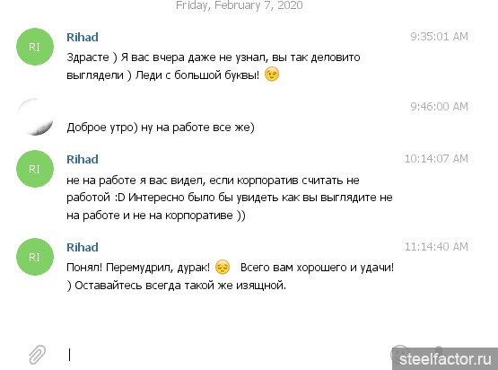 Все как-то двусмысленно очень, ты чо типа грязненьким шалунишкой хочешь предстать?Восьмерочка с работы молча слила меня! И это еще девочка которая неоднократно мило смотрела и улыбалась. Чего-то у меня с виртуальным общением не так )) Может чересчур прямолинейные вопросы, подозреваю так и есть, про то как как бы выглядела не на корпорате и не на работе, надо было как-то издалека начинать, может спросить о том что любит делать и т.д.