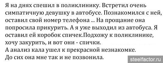 2 мужика идут по деревне, бутылка есть, а закусить нет. Смотрят мужик в поле косит, один другому говорит: "Пошли у мужика попросим закусить". А второй ему отвечает: "Да не, видишь у него какая рожа, полюбому не даст". "Слушай, видишь стог сена стоит, мужику наверняка жена принесла, что-то поесть, давай заползём потихоньку и посмотрим". Подползли они в общем, смотрят лежит хлеб, луковица и кусок сала. ну выпили они, закусили, осмелели и решили пойти спросить у мужика дал бы он им закуски. Поздоровались и спрашивают: "Слыш мужик, если бы у нас было выпить ты бы дал нам хлеба? " Тот говорит: "Хлеба? Дал бы". "А лука? " "Лука? Дал бы. " "а сала? " Тот отвечает: "Не, сала бы не дал". Один мужик другому говорит: "Я же говорил жлоб". А мужик отвечает: "Не, вы ничего не подумайте, просто на солнце жарко и задница потеет, а я её салом смазываю, чтобы не натиралась". Один другого херак по башке: "Я ж говорил тебе говном воняет, а ты Копчёное, копчёное"