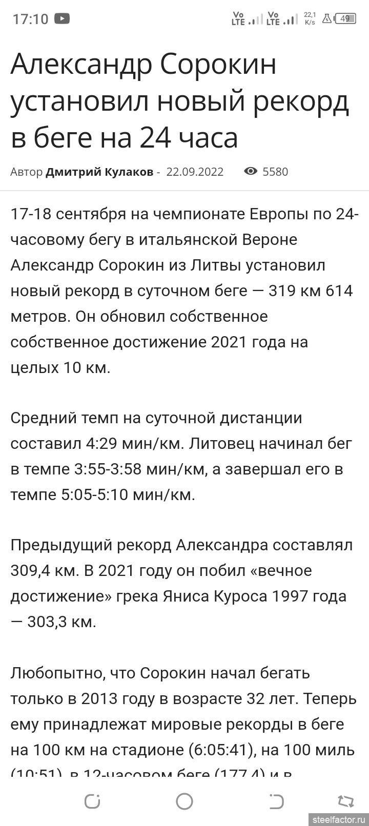 Мировой рекорд в суточном беге 309 км.