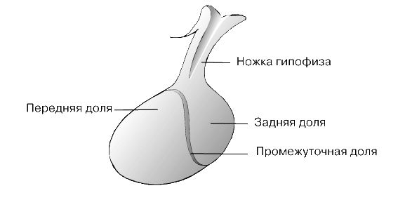 Гипофиз состоит из трех долей: передней, промежуточной и задней. Первые две доли состоят из железистой ткани и образуются у эмбриона из кармана Ратке – переднего выпячивания кишечной трубки. Заднюю долю образует вырост нервной ткани, идущий от дна промежуточного мозга. Все эти доли фактически являются отдельными железами, и каждая секретирует свои собственные гормоны.