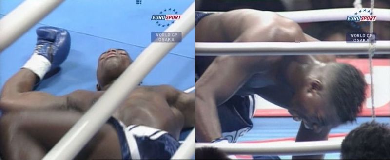 Понятно что от удара такой махины Рей падал несколько раз при попытке подняться, ни о каком продолжении не могло быть и речи.