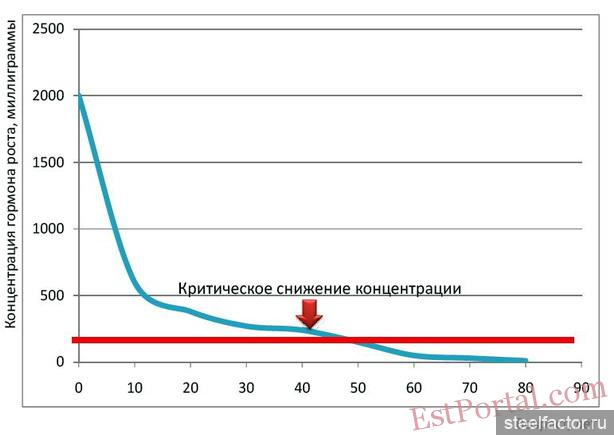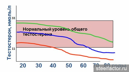 И действительно, мы замечаем, что с возрастом признаки снижения уровня тестостерона (подробнее о них мы скажем ниже) становятся все заметнее. Тем не менее, совершенно закономерно возникает вопрос - почему же одни мужчины становятся «развалинами» к 40 годам, а у других – в 70-летнем возрасте появляется 5я жена? Все дело в индивидуальных сроках наступления андрогенного дефицита (так мы называем процесс снижения уровня тестостерона). Те мужчины, у кого уровень тестостерона был изначально более высоким, придут к своему андрогенному дефициту позже, чем те, у кого уровень тестостерона первоначально был не очень высок (Рисунок 1). Кроме того, существуют факторы, способные резко ускорять сроки наступления андрогенодефицита. Например, это стрессы, вредные привычки, неблагоприятная экология, длительный прием лекарственных препаратов, а также сопутствующие заболевания. Например, такое опасное заболевание, как ожирение (его еще называют чумой 21 века) способно ускорять темпы снижения тестостерона в 2 и более раз.