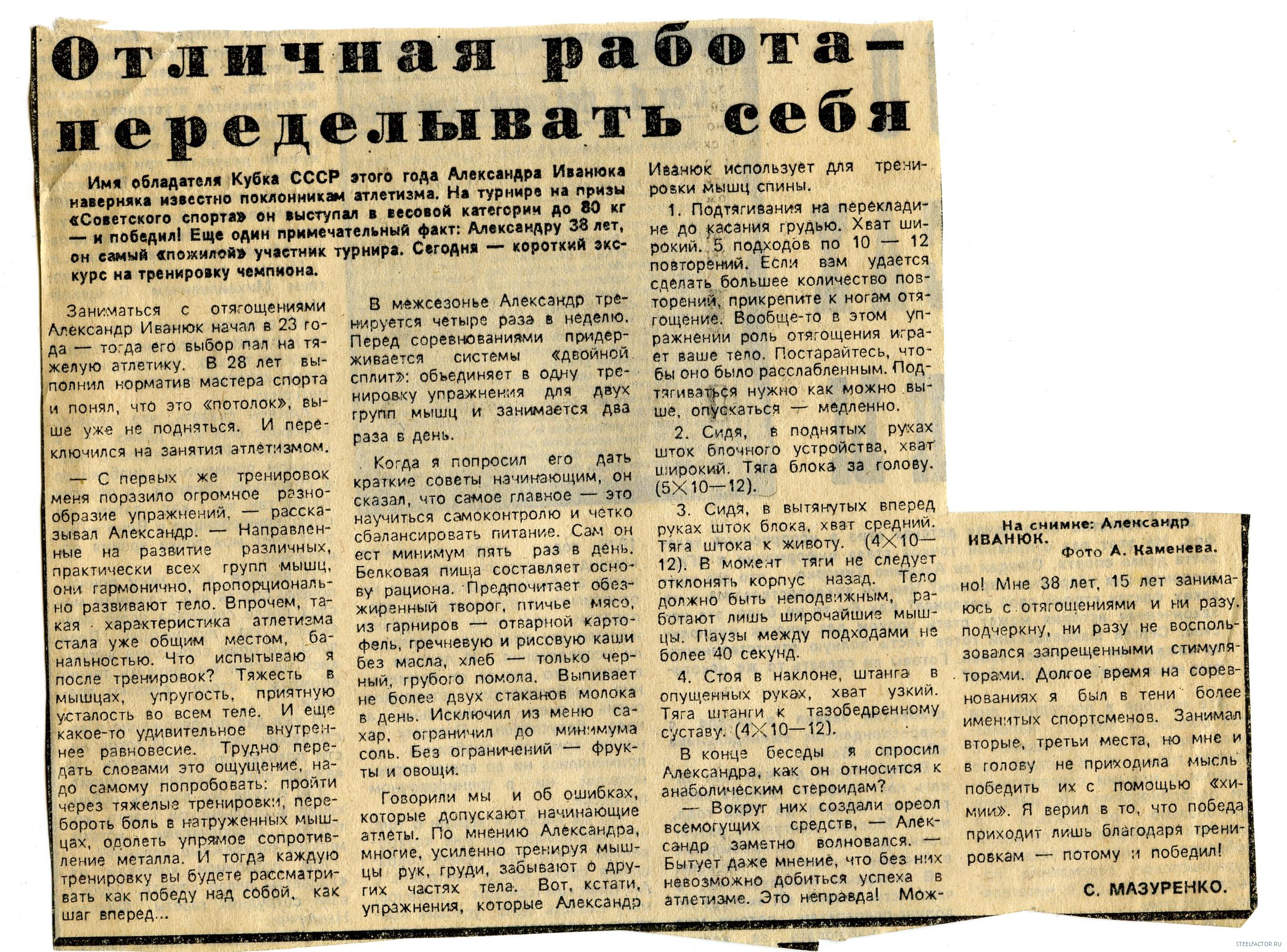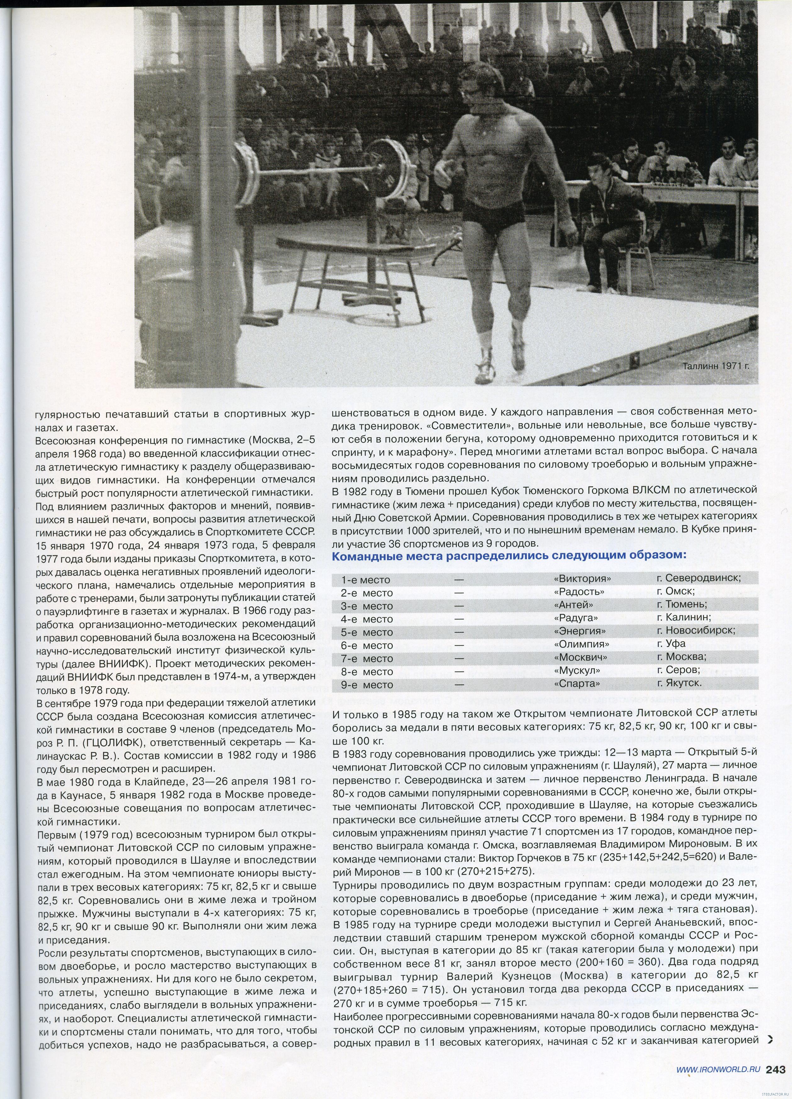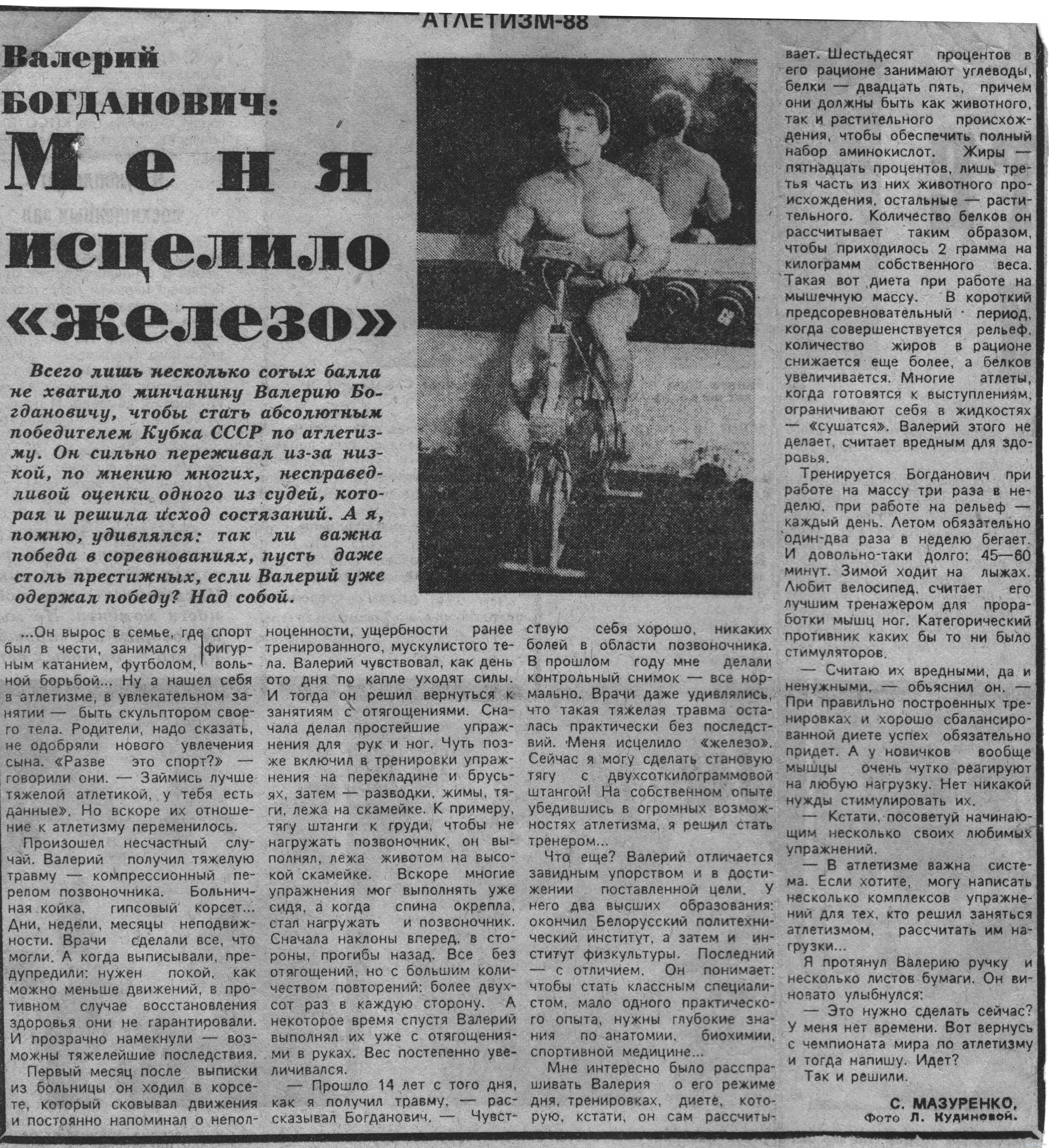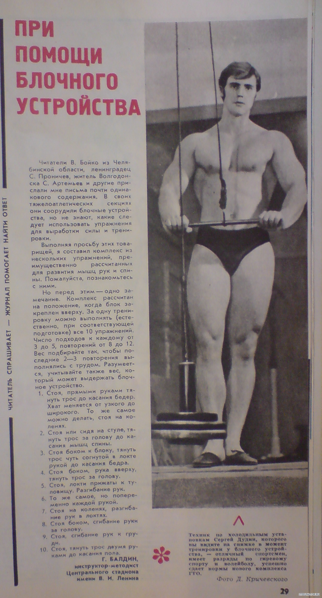 Геннадий Балдин( на фото ему 28 лет, работал в то время техником осветителем на телевидении). Балдин на десятилетие стал моделью журнала "Спортивная Жизнь России"-в комплексах на фотографиях, почти всегда он. На данном фото у него бицепс -39 см, грудь-110 см,талии-79 см. Жмет лежа штангу-110 кг, подтягивается -19раз, приседает-145кг. Вот уж кто, знает об атлетической гимнастике тех лет-все,(с ним бы пообщаться)-но, молчат ветераны!