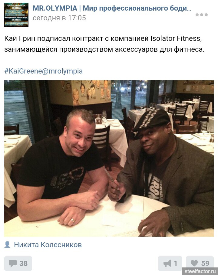 Добро Утро Всем Толкко хочу попрасит те кто хотят смотрет Кай Гриин На саите www.flexonlin.com. Там ест под раздел називаетса PETTISION Там кто хочет можно заполнят форма и написат свои емаил данни и написат сообление и там будет оказано как ето делаетса и всех кто заполнет отправлаетса до главному Промоутором Мр Олимпия. P.S. Именно и тот же саите тот же Промоутер гаварит в интервю что мол Кай Грийн не подписал свои договор для участие в прописаном ети сроки . Для мена ето бред у кого едт желание толко можна заполнит отправит форма ето сообшением. Строчка називаетсаPETITIONS