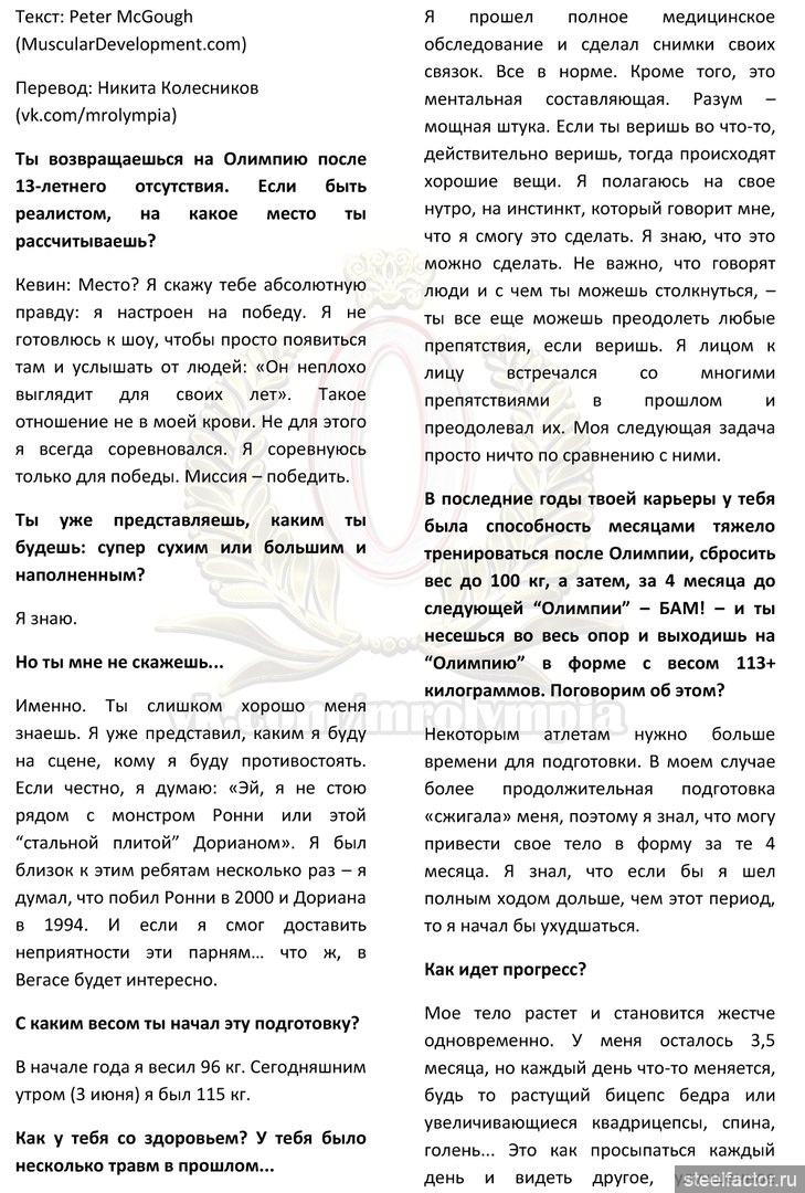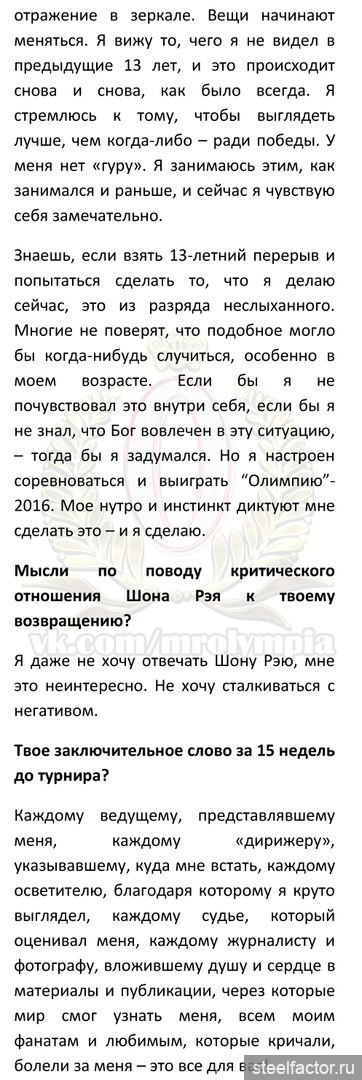 16 кг качественной массы ещё плюс он наберёт 5-10 может кг три с половиной месяца осталось думаю что время у него ещё есть"Просто занять место? Я говорю вам абсолютную правду, я буду бороться лишь за победу. Я не тренируюсь ради шоу, что б выйти и люди сказали "да он хорош для своего возраста". Это не в моем характере. Это не то, ради чего я когда либо выступал. Я выступаю лишь что бы победить. Миссия - ПОБЕДИТЬ