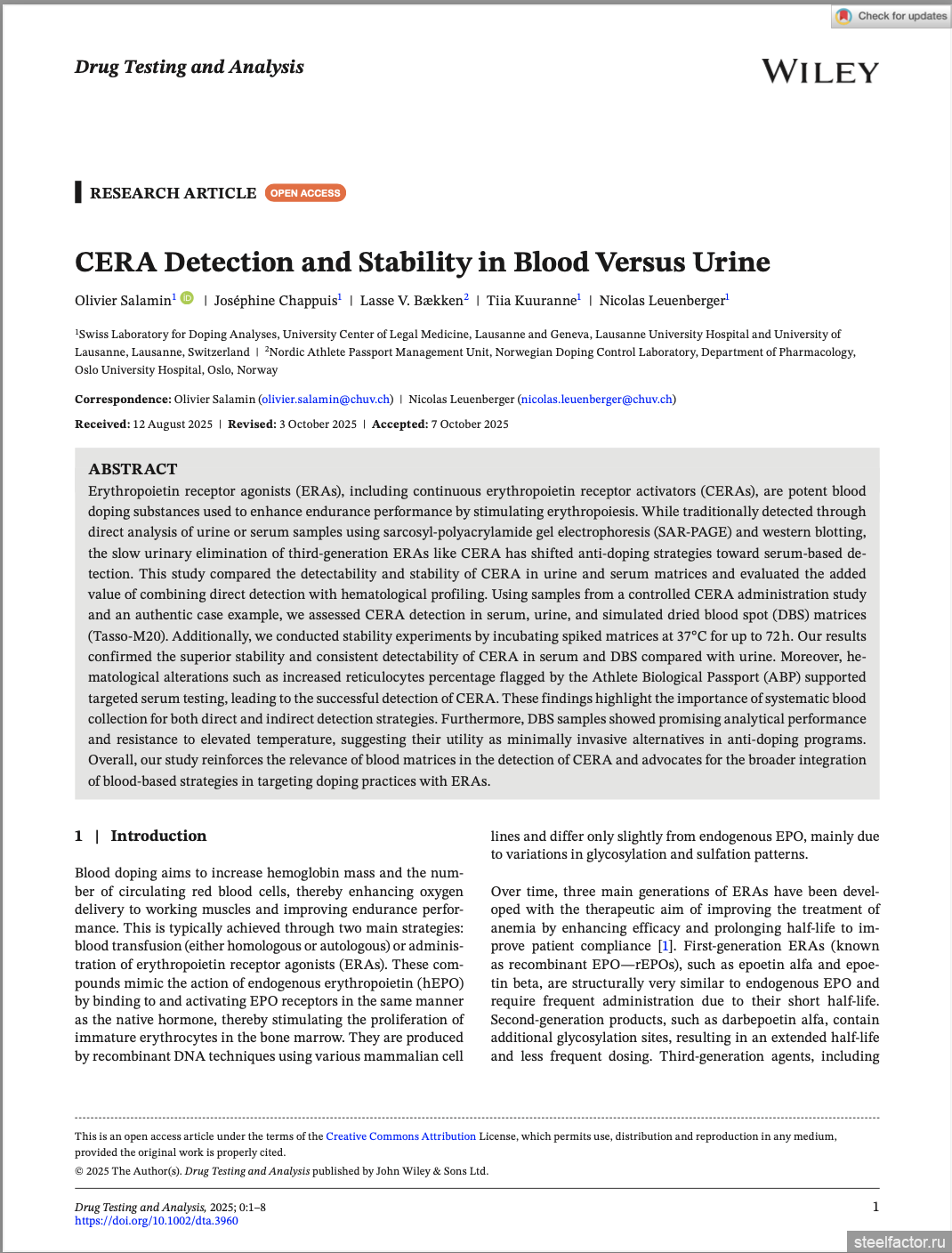 Директор антидопинговой лаборатории Лозанны Тиа Кууранне и соавторы изучили возможности определения метоксиполиэтиленгликоль-эпоэтина бета (CERA), продающегося под торговой маркой «Mircera» (Roche) по сухим пятнам крови (DBS), сравнив с вариантом детекции по моче.