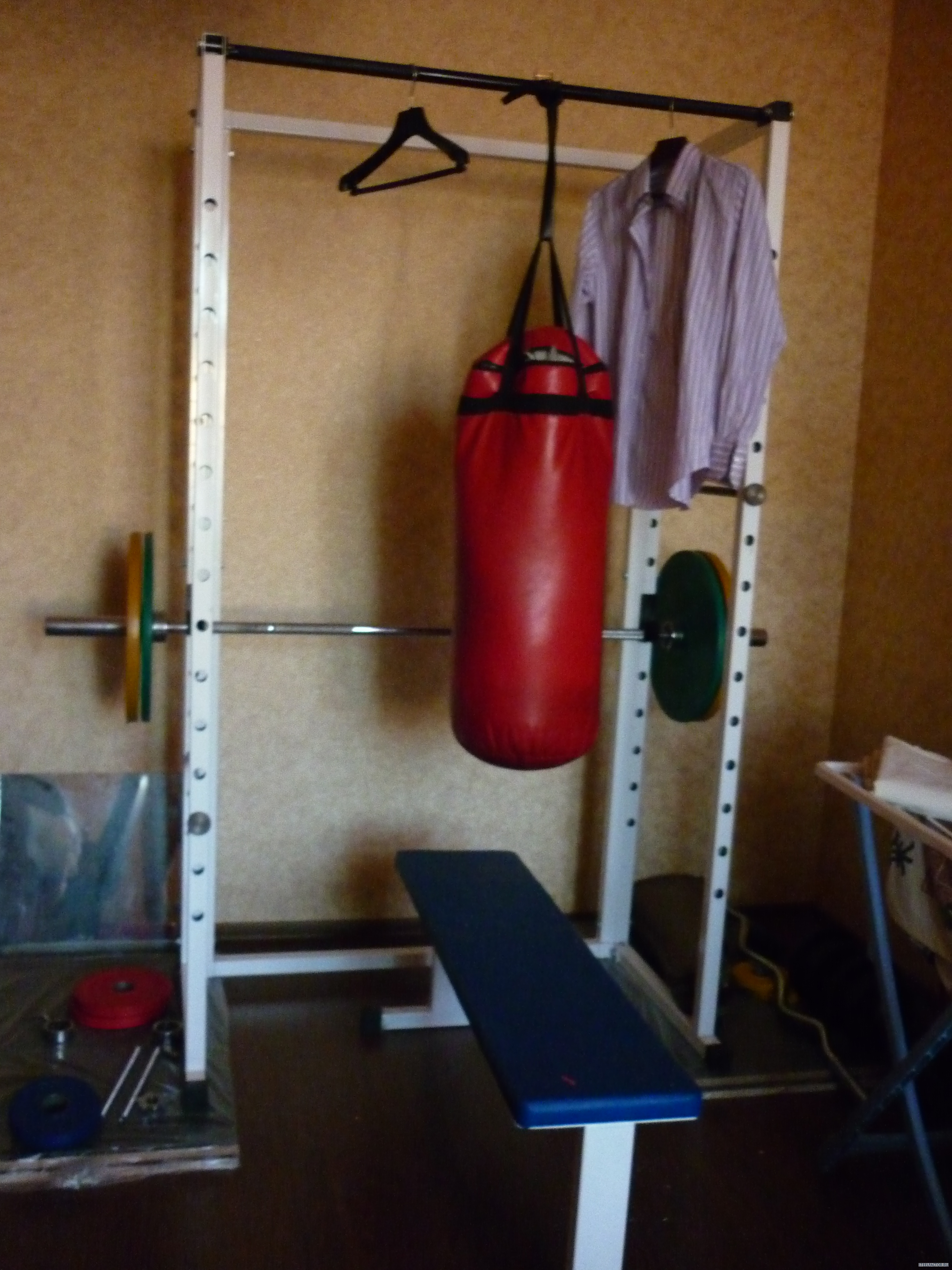 Заниматься планирую дома, есть силовая рама, штанга с блинами на 150 кило, гантели разборные 25 кило, изогнутый гриф.