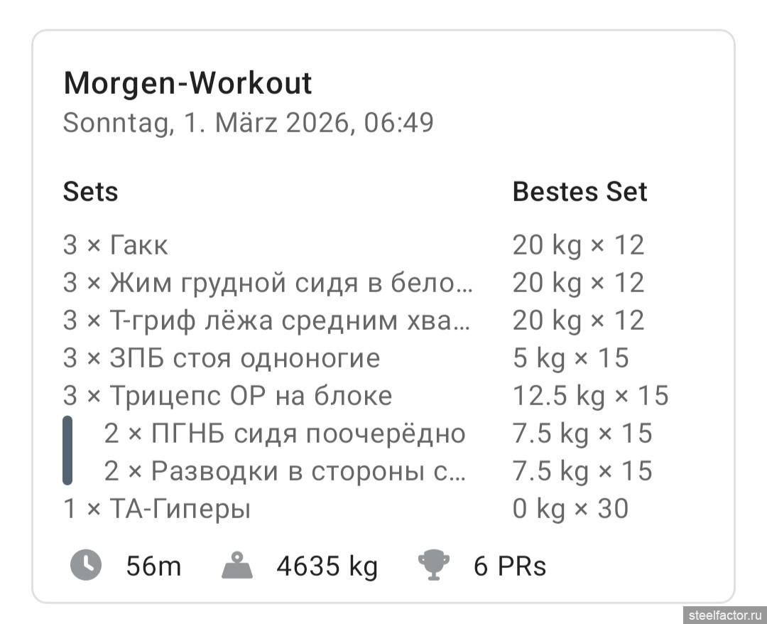 Да у тебя и в зале то кардио. С этими весами можно и по 100 повторов делать.)Плюс кардио несколько километров (тудаобратно на лисапете)