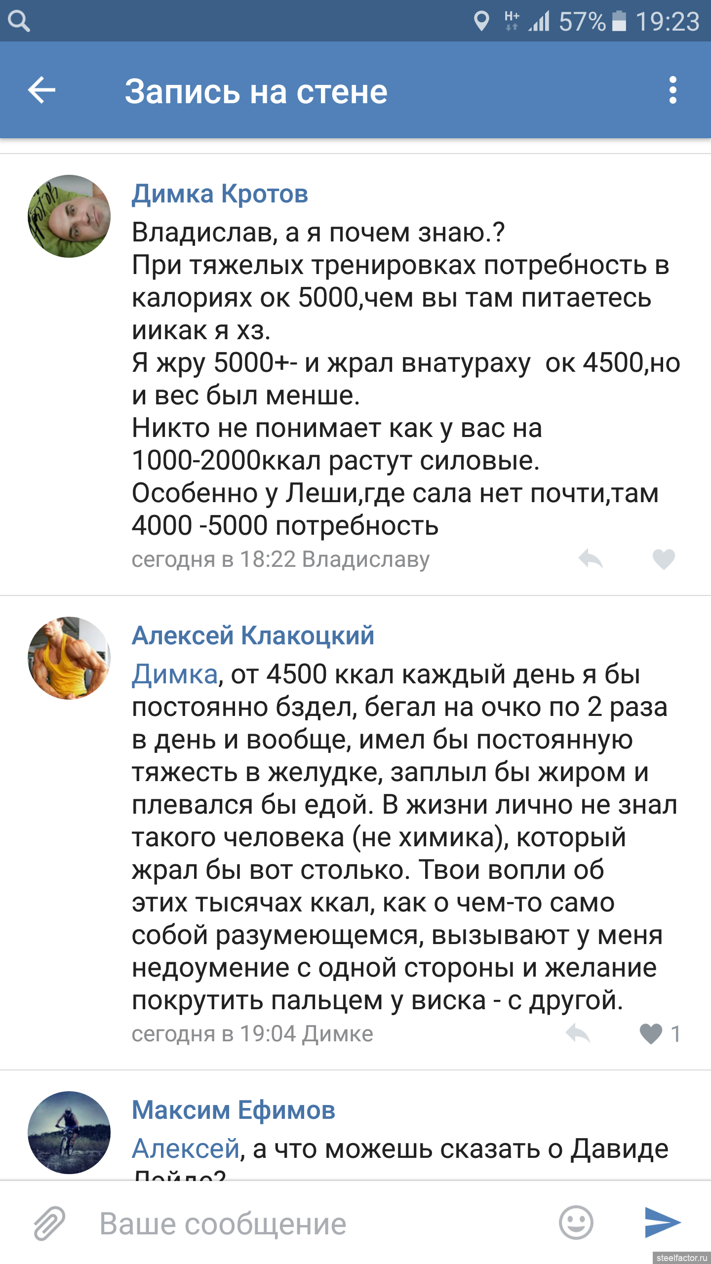 По тренингу. Вполне может быть, что не дорабатываю. Но так было не всегда. Я бывало еле еле спускался по леснице вниз после трени ног. Крепатура адская в последующие дни, и аппетит есть, все хорошо, а массы нет. А вот на курсе на той же диете в 2000 калорий я набрал с 61 до 78. Да говна набрал много, кг 5-6 точно, но все равно это прогресс, а не на одном месте топтаться. И при этом я тупо шарился в зале по сравнению с натурахой.