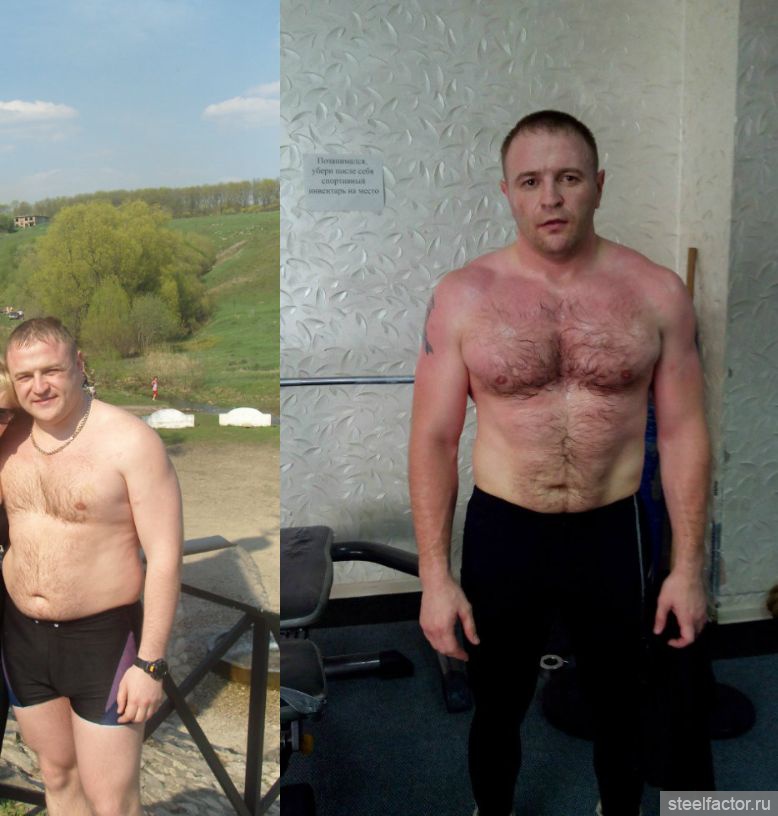 Я весил в том году в мае примерно 125 кг.Стало очень трудно ходить,да и лежать было совсем не комфортно.И как то ранним утром я понял что дальше так жить больше неправильно.Я начал потихоньку мучить себя диетами.А в августе пошел в спортзал.В этом году привел в порядок свое питание,да и в зале пошли для меня результаты.И теперь я повыкидывал все свои одежды 60 размера и купил 52.Вес у меня 98 кг.Работы еще поле не паханое.Но теперь не страшно в зеркало смотреть.