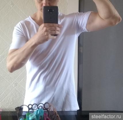 с покупкой и с праздником Вас! можно без напряга фотку посмотреть в футболке с опущенными руками?как сидит хочу глянутьВзял на скидке 2 майки полупидарки, но они L, медиум не было. Навырост до 71кг ))
