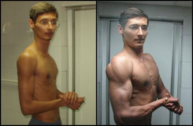 Ты себя в зеркало видел, эктоморф?...В далеком 92 году, я начал заниматься когда мне было 19 лет, с весом в 59 кг при 178 см роста, бицепс был 29,5 см., грудь ( на вдохе ) - 92 или 93 точно не помню. Т.е. типичный эктоморф.