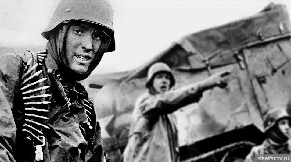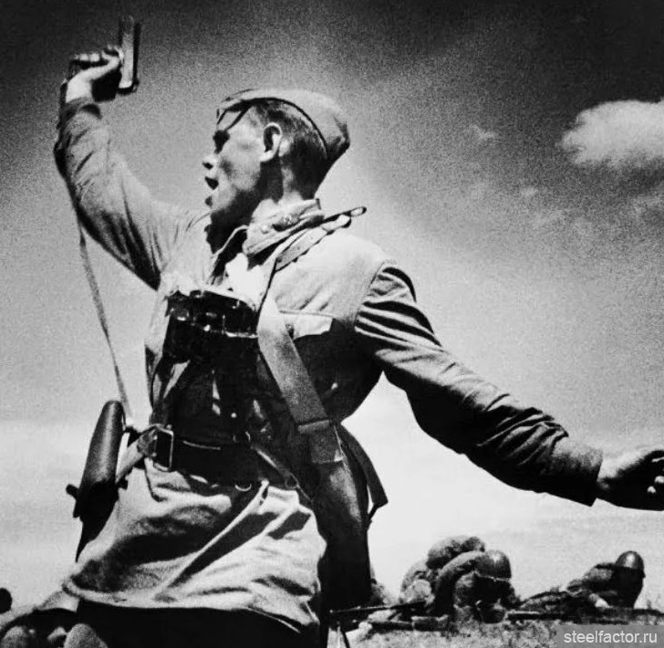 На фотографии изображён командир, поднимающий солдат в атаку с пистолетом ТТ в руке. «Комбат» — одно из самых ярких и выразительных фото времён Великой Отечественной войны.