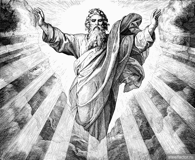 На изображении представлена гравюра, изображающая Бога Отца, парящего среди облаков и лучей света. Это классическое религиозное изображение, часто встречающееся в западном искусстве.
