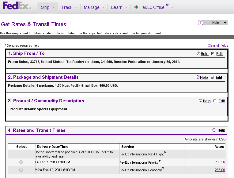 Не поленился, посчитать. Итак маленькая посылка, из штата Айдахо в Ростов на Дону, содержащая "спортивный инвентарь" весом 1,5 кг оцененная в $100. Доставится до вас экспресс-курьером FedEx за ....