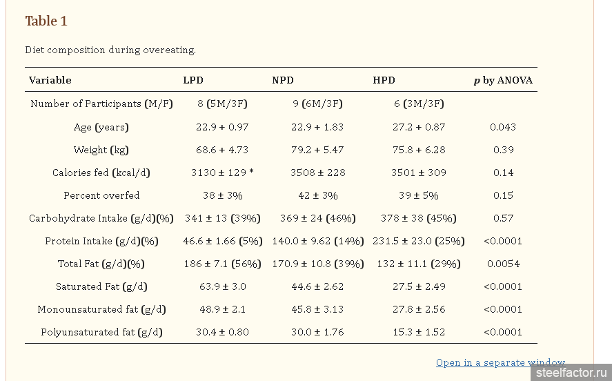 Все-таки странные результаты. Переедание белком привело к бОльшему набору общего веса и жира, чем переедание жиром...
