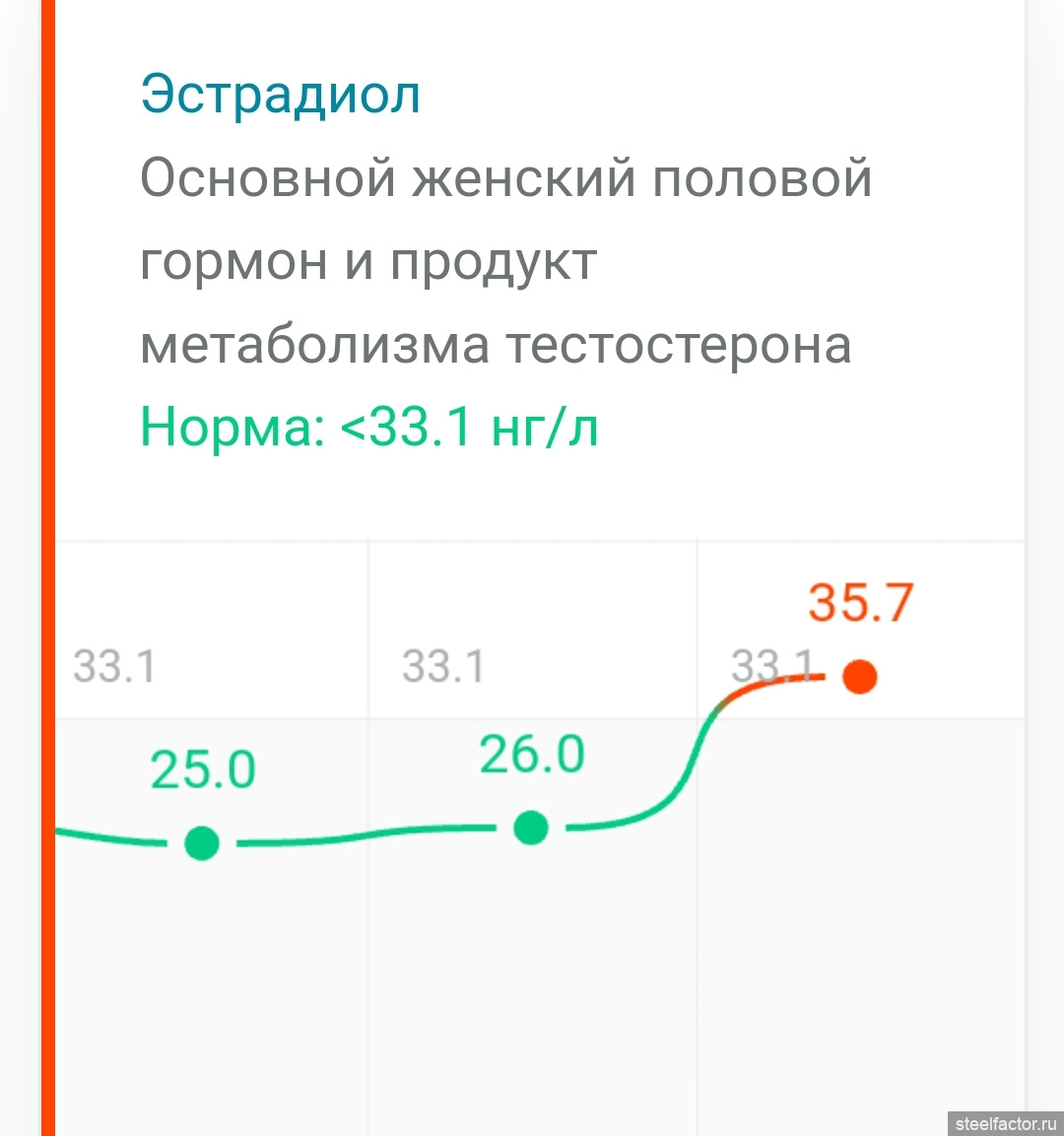 Привет. Смущают. Поэтому и надо методом тыка "поиграть с дозой" и интервалом. Я для себя нашел,делаю пол куба ципионата (100 млг) на 6 ой день. Тест -38-42 ннмоль. Эстрадиол чуть выше референса-52,ГСПГ в норме. Осталась одна проблема гематокрит,"гуляет " от 49 до 52,5. Пока пытаюсь бороться естественными способами,без слива и эретоцитофереза.