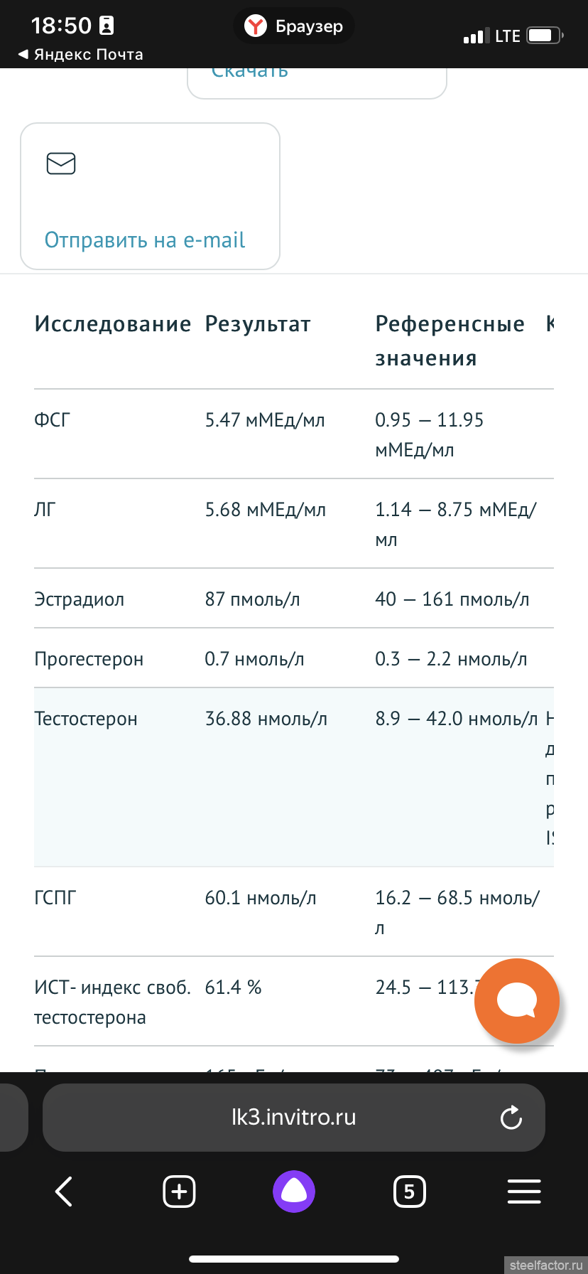 лет так 5 думаю чтобы уйти на ГЗТ. Недавно сдал анализы и непонятно, что со свободным тестом, в норме ли он? Там в нмоль, попытался его перевести в пмоль и ничего не получилось. 41 год, зож, качалка. чувствую падение либидо, может где то меланхоличные чувства иногда...Может кто подскажет по анализам норм или нет...Общий тест-20 нмоль/л. Свободный тест-0,4150 нмоль/л, ГСПГ-36.5 нмоль/л, Индекс своб.андрогенов 56.0%, ЛГ-2.87 мМЕ/мл, ФСГ-5.60 мМЕ/мл, гематокрит-47.9, Эстрадиол 117 пмоль/л, пролактин 202 мМЕ/л, ПСА-0.85 нг/мл.