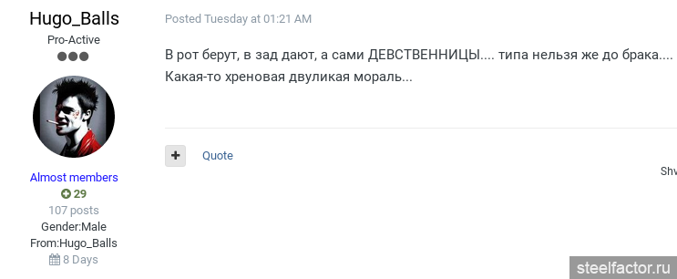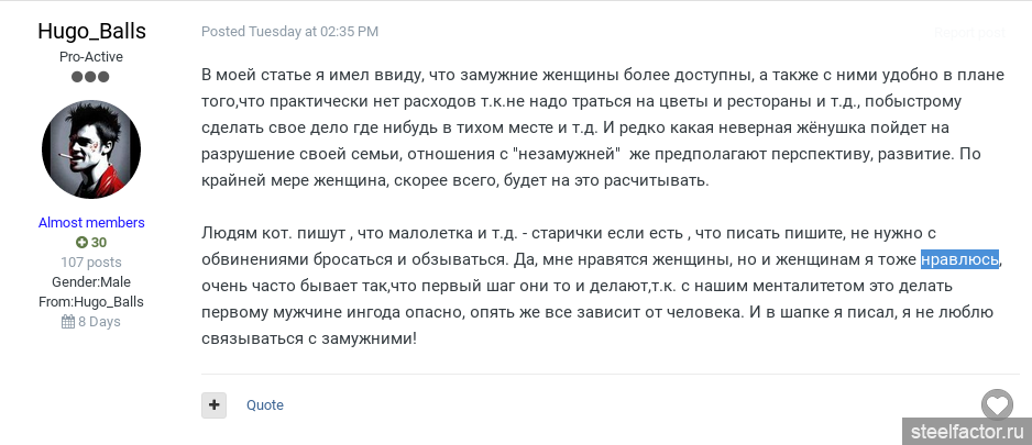 Это с второсортами. А он альфач. С ним лишь бы перепихнуться по быстрому. Правда он почему-то пишет, что с незамужними якобы ему требуются какие-то стандартные ухаживания и расходы, не прямо пишет, а косвенно, что типа с замужними этого не требуется. Уверен, что раз он альфач, т.е. бабам нравится сам по себе, с незамужними ему точно тоже деньги не нужны. Все бабы одинаковы.