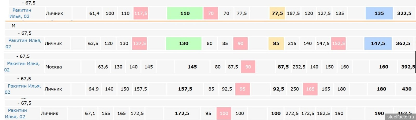 До него прошел русский цикл, присел 130 (до был 115), с.в. ~ 70-72 кг.