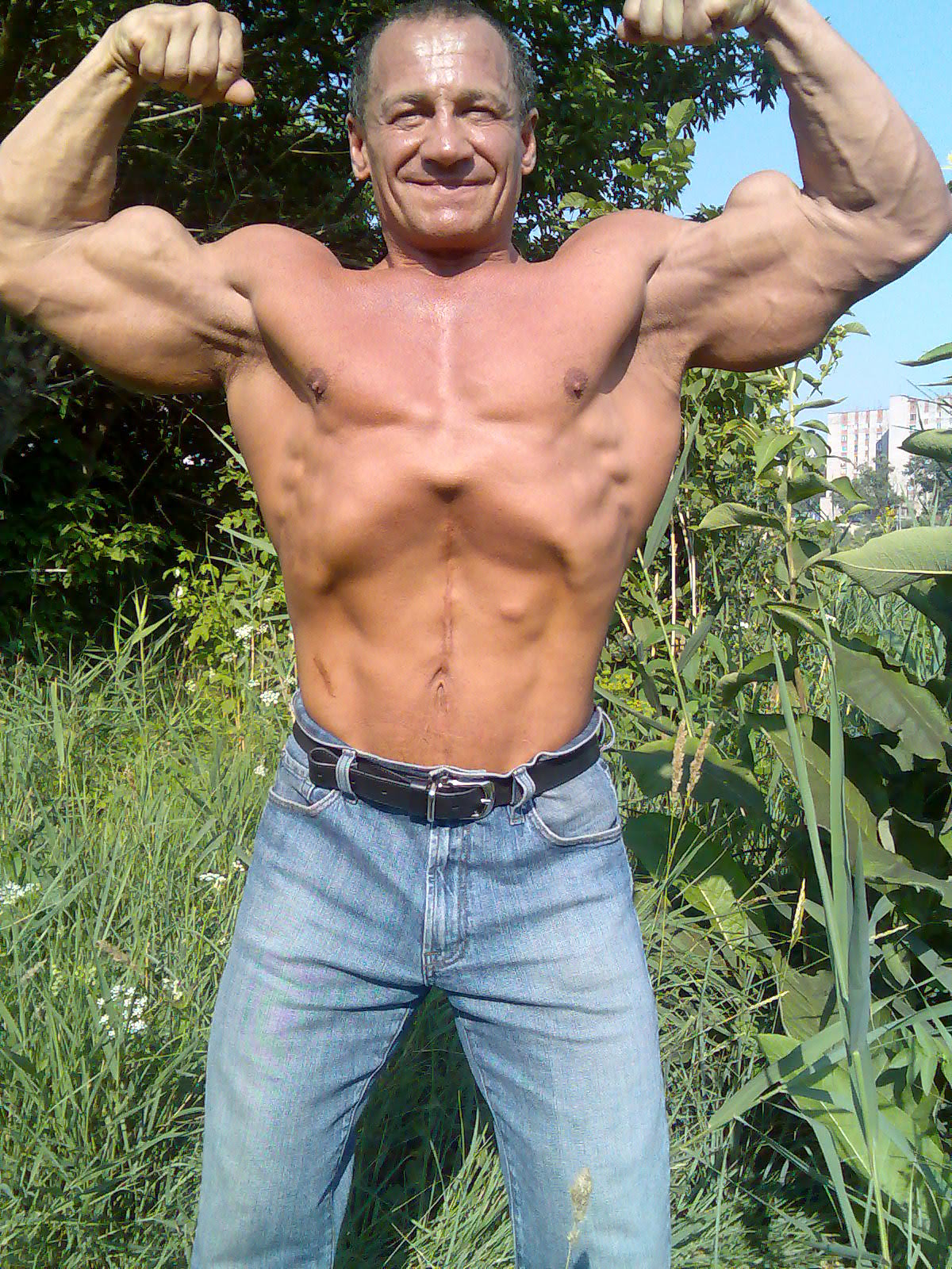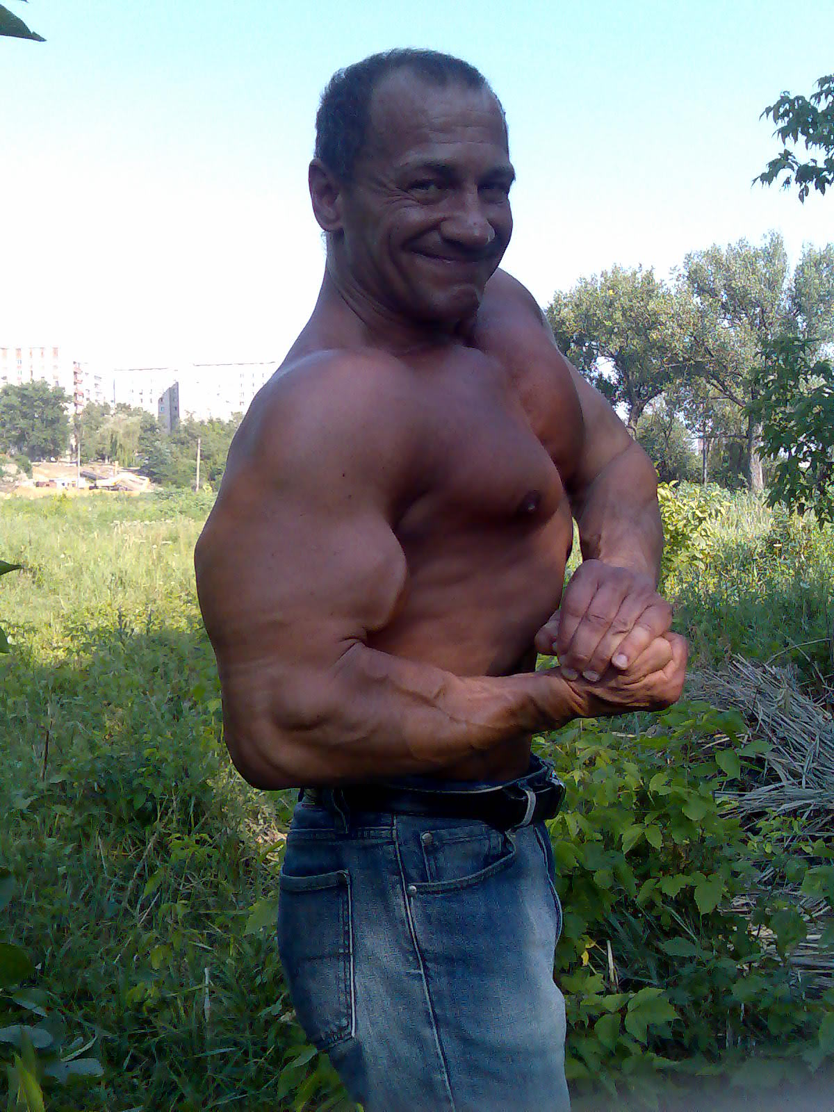 Andrey - elita на протяжении всей жизни руки я тренировал различными способами.В возрасте семи лет я поднимал гантельки по 1 и 2 кг стоя и сидя с упором и много подтягивался.,занимался с 7 до 11 лет спортивной гимнастикой,в 11 лет я начал заниматься вольной борьбой,а с 12 лет Самбо,день ходил на вольную,другой день на самбо,плюс к этому качался,занимался без выходных,с 13 до 17 лет занимался боксом,выступал на соревнованиях.Вто время,что я занимался в этих секциях,все говорили мне,что руеи у меня очень большие,сейчас конечно многие бы посмеялись с тех обьемов в 14 лет бицепс был 36 см,но все относительно.Серьезно качатся я начал в 17 лет,ходил в зал тяжелой атлетики,тренировки продолжались порой до 3-4 часов т к тренер запрещал качаться прижодилось делать тяжелоатлетические упражнения рывок и толчок штанги и только когда тренер выходил покурить,все резко начинали качаться,благо,что тренер курить ходил очень часто,вот такой ББ был в 70 годы в СССР,естественно ни о каких протеинах и креатинах мы и служом не слыхивали,при это некоторые парни накачивались до весьма серьезных кондицвй,особенно это касается верха,сейчас я читаю на форуме,как некоторые пишут,что без приседаний и тяги становой невозможно накачать большие руки,это полный бред,я конечно в настоящее время очень люблю качать ноги,особенно приседать,но в то время практически никто из культуристов ноги не качал,в том числе к сожалению и я,при этом у качков руки по 50 см были не в диковинку,я перешол границу 50 см в 1983 году,при жиме лежа 200 кг приседал я в то время от силы 170 кг