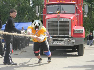 помоему это фура гонится за пандой, а та уже хочет по лиане из последних сил свалить из этого ада, а тут еще и зрителей набежало )))