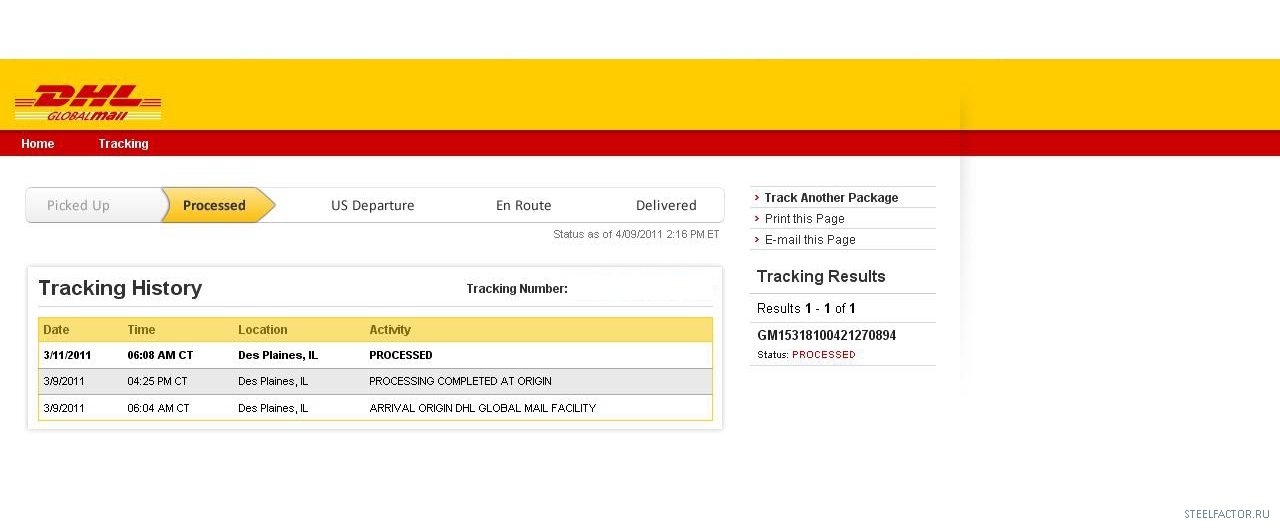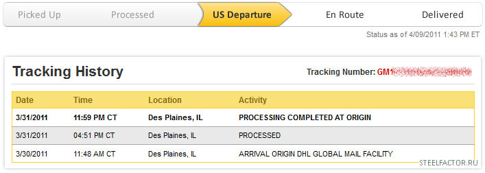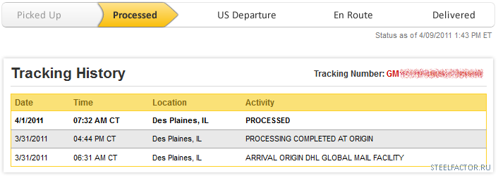 у меня две посылки одна от 11/03 висит 3/11/2011 06:08 AM CT Des Plaines, IL PROCESSED