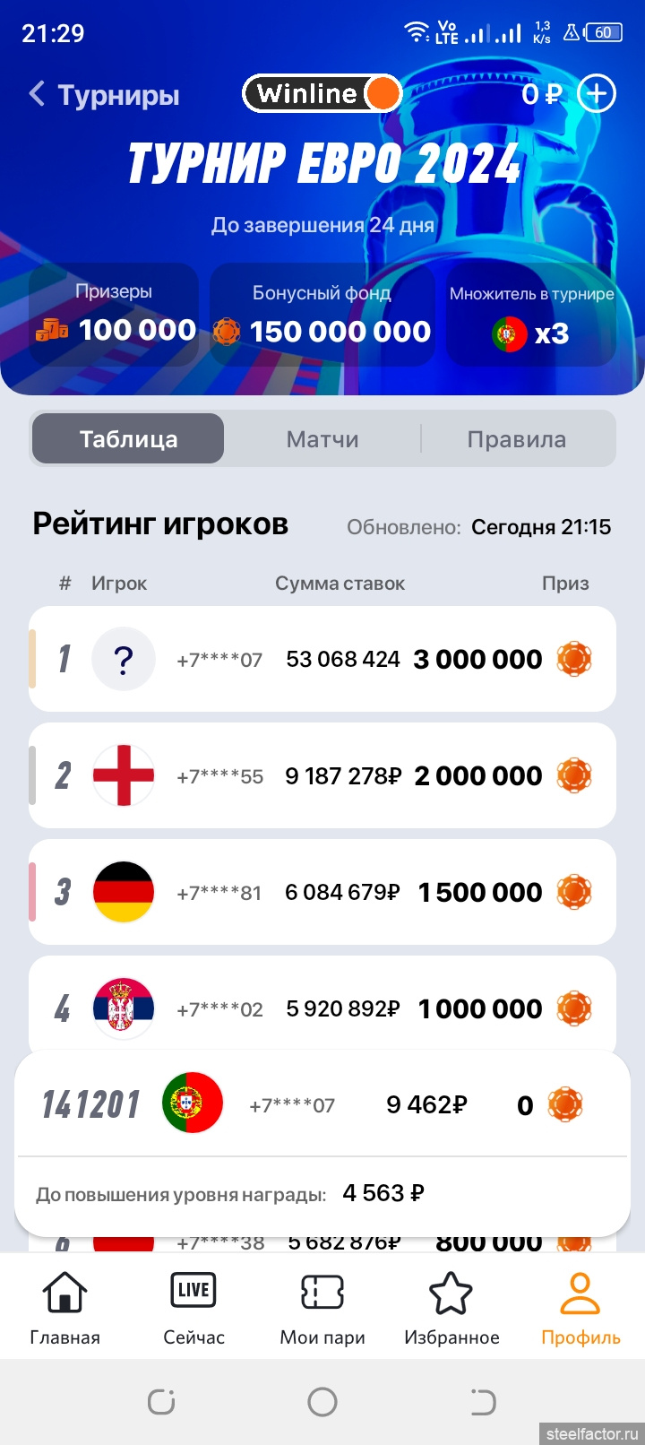 Вот рейтинг игроков на Винлайн по суммам ставок на ЧЕ: